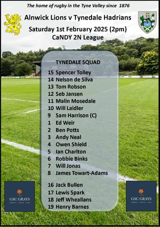 Tynedale – J. Fletcher; C. Johnston, G. Fleming, C. Leslie, S. Ferguson; J. Paton, S. Clayton-Hibbott; R. Parker, E. Parker, M. White; C. Hewitson, A. Oglethorpe; P. Leonard, M. Lee, G. Yates. Rep. I. Donkin and S. Turnbull.