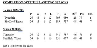 All told, since 2016 there have been 15 League Matches, 14 wins for Tynedale, only 1 for Sheffield Tigers (Jan. 2023).